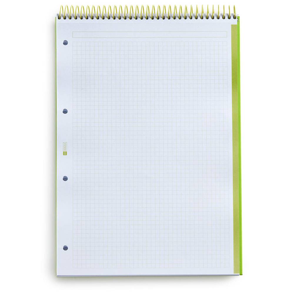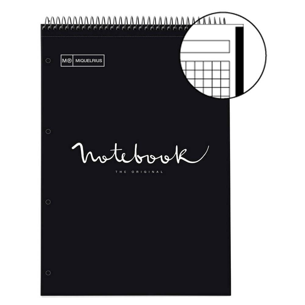 Cuaderno A4 Notebook 1 Cuadriculado Cuaderno de 80 hojas microperforadas con cuatro taladros y cuadrícula de 5 mm con encabezamiento y banda de color Espiral en la parte superior para escribir sin obstáculos Cubiertas extra duras de cartón forrado de papel impreso y plastificado brillante en color negro Papel extra opaco de 90 gr/m² con certificación FSC Mix Credit Producto MiquelRius Dimensiones:21.00 x 29.70 x 0.00