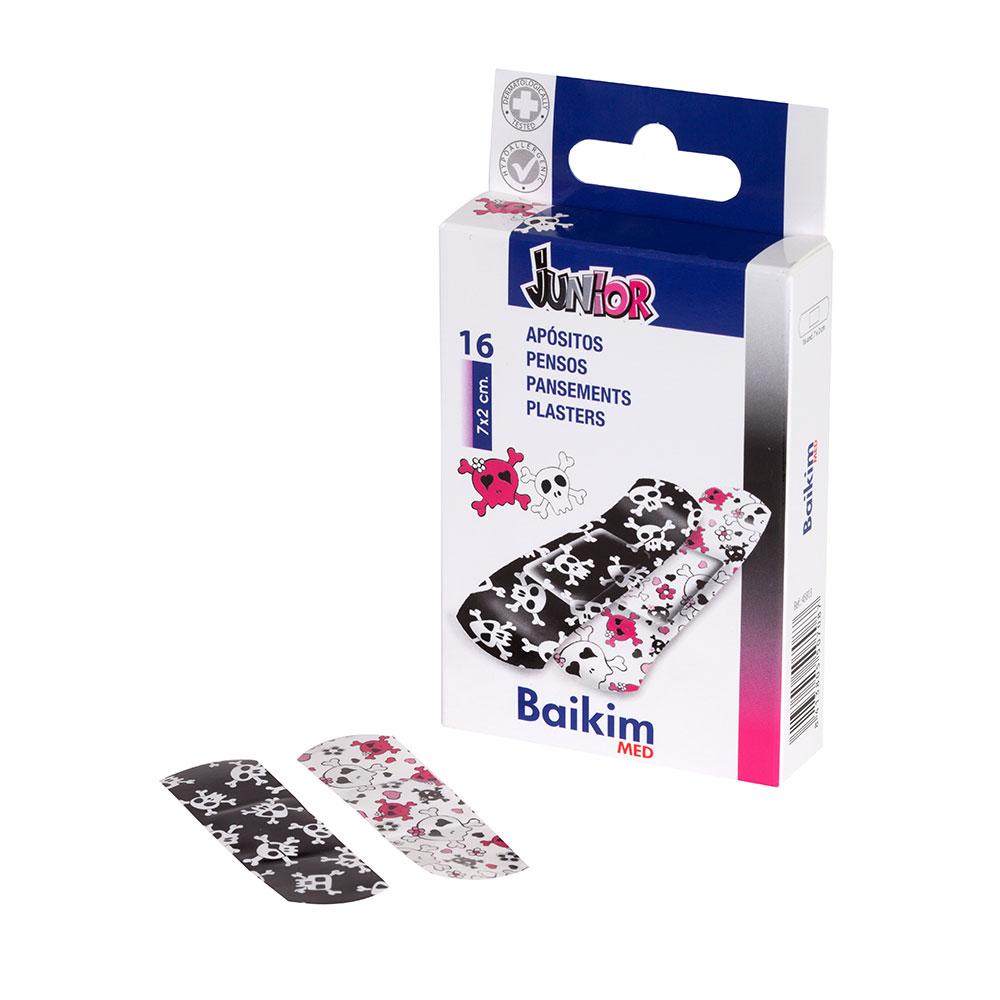 - Apósitos adhesivos hipoalergénicos con dibujos juveniles de calaveras.